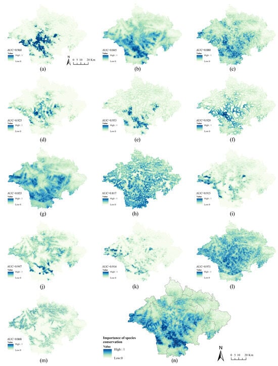 Distribution of habitat suitability and species conservation importance of 13 representative species in the study area. (a) Sichuan snub-nosed monkey; (b) golden leopard; (c) jackal; (d) black bear; (e) forest musk deer; (f) white-shouldered eagle; (g) white-crested long-tailed pheasant; (h) ginkgo; (i) Chinese yew; (j) dove tree; (k) light-leaved dove tree; (l) Qinling fir; (m) bashan torreya; (n) species conservation importance.