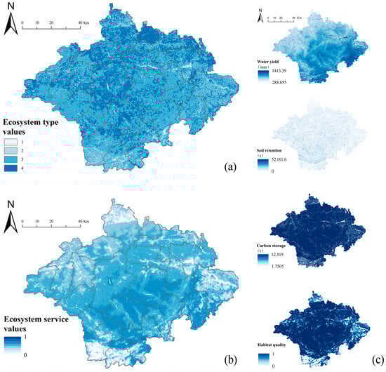 Distribution of ecosystem conservation importance in the study area. (a) Ecosystem type values; (b) ecosystem service values; (c) WY, SR, CS, and HQ.