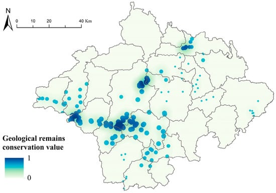 There are 161 major geological heritage resources in the study area. The conservation value of the geological heritage resources was assessed and graded base on rarity, representativeness, completeness, and protectability, using the evaluation criteria of “National Park Establishment Guidelines”, “National Nature Reserve Review Standards”, and “Technical Requirements for National Geopark Planning”, which are currently in force in China. Among these, 77 were classified as Level 1, 50 as Level 2, and 34 as Level 3. According to previous research findings [62], buffer zones of 1500 m, 1200 m, and 600 m were established for Level 1, Level 2, and Level 3 resources, respectively, and a weighted kernel density analysis was conducted for resources of different grades. Results of the two single-factor analyses were normalized and equally weighted to derive the final assessment of conservation importance.