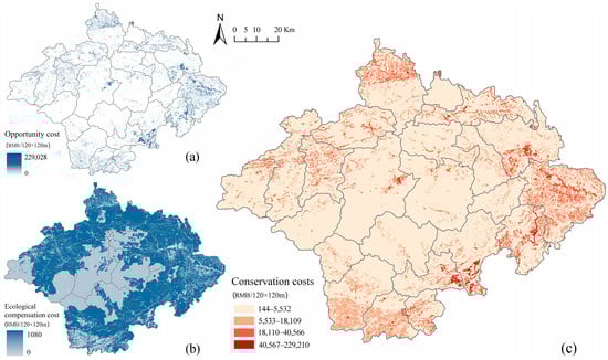 Spatial distribution of conservation costs. (a) OC; (b) ECC; (c) total conservation costs.
