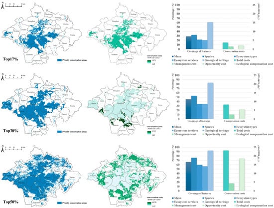 Under the top 50% target, the PCAs of SNP covered 4432 km2, with annual total conservation costs of approximately RMB 231.2 million (Figure 7). The average coverage of core resources within the PCAs reached 66.3%, achieving systematic conservation of high-value areas for all resource types. However, the various types of conservation costs increased significantly, being three to six times higher than the costs of the previous two scenarios, particularly ECC, which rose to RMB 186 million per year. This amount was approximately ten times higher than the average compensation funds for forest ecological benefits in similar national parks in China [68,69,70], indicating low feasibility for implementation at this stage.