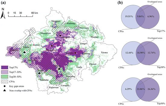 By overlaying the current protected areas (CPAs) with the PCAs, it was found that areas of 882 km2, 1516 km2, and 2068 km2 were protected under the three conservation targets, accounting for 9.84%, 16.90%, and 23.06% of the study area, respectively (Figure 8). Even with the PCAs’ proportion increased to 50%, the coverage of CPAs over the PCAs remained below 30% (the “30 × 30” target), although the 17% Aichi target was well achieved. This result indicated that while CPAs occupied nearly one-third of the study area, their effectiveness in protecting the PCAs was insufficient.