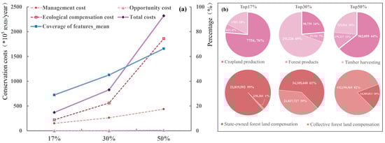 As the protection ratio increased, various costs also rose, with the ECC particularly driving the rapid growth in total expenses (Figure 9a). This increase was primarily due to the substantial proportion of ecological public welfare forests and collective forests, which possess high ecological value and require significant compensation. However, cost variations were observed among different conservation schemes (Figure 9b). Specifically, under the top 17% and top 30% targets, the ECC mainly focused on state-owned ecological public welfare forests, while funding needs for collective forest rights reform remained minimal. In the eastern and northern parts of the SNP, where several state-owned forest farms are located, management systems and compensation entities are relatively unified. This setup enables these areas to adopt a “one-time upfront and periodic follow-up” [73] compensation approach, strengthening the unified forest farm management by the national park administration and allowing progressive implementation of forest management and restoration projects. For certain high-value collective forests, one-time acquisition or buyout methods could be employed by the government to transfer ownership to state control [40]. A dynamic adjustment mechanism could then be established based on forest ecological benefits [74], with regular compensation payments to support the sustainable management of these collective forests. In areas with lower conservation priorities (top 30% to top 50%), collective forests are widely distributed, leading to significant funding gaps for land transfer and challenging timely and sufficient funding. Therefore, the existing ownership structure may be temporarily maintained, with flexible and diversified compensation measures [75,76] adopted to establish a community co-management model [77], thereby easing financial pressure on the government.