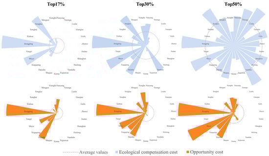 Although the OC was the smallest among various costs and exhibited little variation, significant differences were observed in its composition for cultivated and forest land across different targets (Figure 9). Under the top 17% and top 50% targets, over 60% of OC originated from agricultural production, followed by timber harvesting. Conversely, the restriction on timber harvesting was particularly pronounced under the top 30% target, representing nearly 70%. The impact on forest product collection revenues remained minimal across all targets. Consequently, the designation of PCAs under different scenarios will have varying impacts on the livelihoods of national park and surrounding community residents, and will require more diverse and dynamic cost management policies. For the top 17% target, the areas of cultivated land or timber forests in the PCAs were minimal and scattered, making one-time acquisitions or land exchanges feasible and cost-effective. However, for the top 30% and top 50% targets, losses in agricultural production and timber harvesting revenues increased significantly, exacerbating livelihood challenges for communities and substantially expanding the scale of land transfer required. Directly prohibiting farming or restricting logging may force residents to alter their livelihoods, potentially increasing production activities in adjacent forest areas, which could lead to unforeseen ecological consequences [78,79]. Additionally, such measures could exacerbate the wealth gap, leading to a series of challenges including voluntary or forced relocation, difficulties in re-employment, and social disconnection [80,81]. Therefore, as conservation targets increase, priority should be given to introducing flexible transfer modes such as long-term leases and easements, giving full consideration to the residents’ sense of belonging to the land, and dynamically adjusting the amount of compensation so as to safeguard the long-term livelihoods and interests of the community.