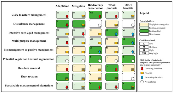 For each included record, I assigned a specific weight to the potential effects of forest management practices (those included in each record) on adaptation, mitigation, biodiversity conservation, wood products, and other benefits: 0 for negligible or negative potential effect; 0.5 for moderate, positive potential effect; 1 for high, positive potential effect. Forest management effects are distance-dependent: the higher the effect, the shorter the distance from the maximum value (=1). I then attributed a confidence level to each correspondence between a management practice and a management goal, partly following the IPCC guidance on the consistent treatment of uncertainty in reports, i.e., authors’ judgments about the validity of findings, as determined through evaluation of evidence and agreement ([34] p. 3). The confidence levels are classified as low confidence (L), medium confidence (M), high confidence (H), and very high confidence (VH), each representing a 25% step increase in the frequency of observations over the maximum number of observations.