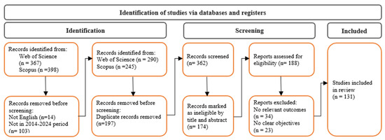 The search yielded 188 papers. The review follows the PRISMA (Preferred Reporting Items for Systematic Reviews and Meta-Analyses) guidelines to ensure a rigorous and unbiased analysis of relevant studies [44]. Each study was meticulously screened to assess its relevance, focusing on the clarity of objectives, robustness of methods, and relevance of outcomes. Studies lacking clear objectives, employing weak methodologies, or presenting findings unrelated to the scope of this review were excluded. The review primarily concentrated on studies addressing the PCI effect, as well as design and site-related factors influencing PCI. Papers that focused solely on LST without addressing PCI were excluded. After applying these criteria, 131 studies were selected for detailed analysis, as illustrated in Figure 1.