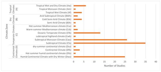 The location of a park and its background climate conditions are pivotal in shaping its cooling performance and influencing the effectiveness of design-related factors. Background climate refers to the long-term climatic characteristics of an area, which impact the local weather patterns and environmental dynamics. These conditions include key meteorological elements such as temperature, humidity, precipitation, wind patterns, and solar radiation, all of which interact over extended periods to affect the park’s cooling potential. A Study showed that the cooling intensity of parks tends to be weaker in cities with humid and hot summers compared to those with dry and hot summers [47]. While relative humidity in cities can limit the cooling effects of urban parks, increasing wind speed can significantly enhance the cooling impact of tree-covered areas [103]. Excessive humidity often reduces transpiration intensity in green spaces, thereby diminishing their cooling effects [128,132]. In Hong Kong, stronger cooling effects were observed on hotter days, while the humidifying effects were more pronounced on less humid days [75]. Another study in Hong Kong revealed that cloudy and windy conditions can weaken the cooling effects of landscapes, whereas strong solar radiation can enhance them [76].