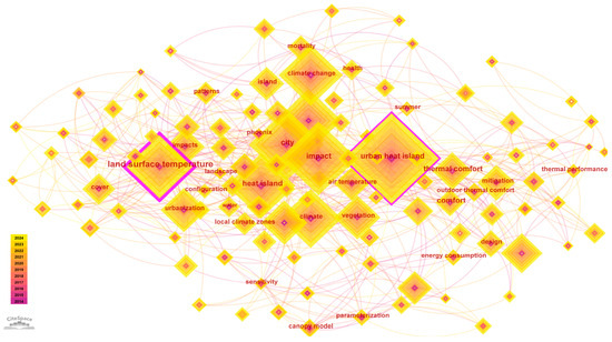 This study utilized CiteSpace software (V6.2.R4) for visualization and analysis to investigate the research hotspots and emerging frontiers in UHI studies. Based on experimental outcomes, a ten-year timeframe was selected. The search parameters were set to include journal articles from January 1, 2014, onwards, yielding 8260 results. The configuration of the analytical parameters was as follows: time range from January 2014 to November 2024, with annual time slices and “keywords” selected as the node type.