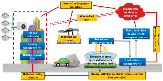 The phenomenon of the UHI is typified by elevated temperatures in urban areas relative to the surrounding suburbs. This climatic anomaly arises from various urban features, including the prevalence of heat-absorbing surfaces and the scarcity of natural thermal regulators such as vegetation. Consequently, urban environments accumulate thermal energy during daylight hours and subsequently emit it after sunset, thereby elevating ambient temperatures [23]. This thermal phenomenon is observed and intensifies in numerous global urban centers, primarily attributed to anthropogenic activities, modifications in urban structure, and climate-related impacts, collectively contributing to heightened temperatures within city limits [24,25,26].