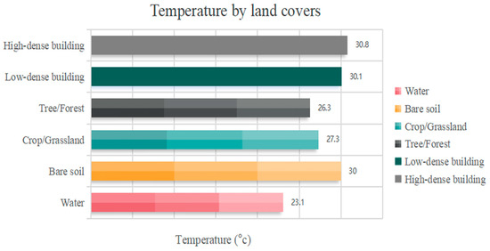 The proliferation of artificial heat emissions poses challenges to urban development [73]. Significant reductions in surface temperature can only be achieved through extensive redevelopment efforts, with outcomes independent of site size. Such initiatives primarily involve reducing artificial surfaces and expanding green spaces. Conversely, less intensive redevelopment strategies appear to have a minimal impact on surface temperature (Figure 5 shows the LST in different land covers). Anthropogenic heat, particularly from the high energy demands of air conditioning systems, represents a distinctive source of warming of the canopy air, especially during daytime hours and in arid climates [74].