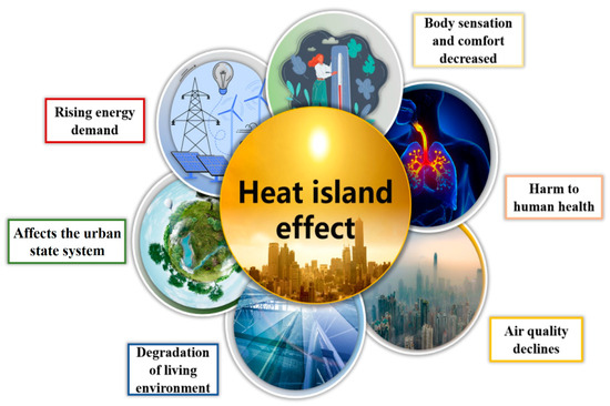 As illustrated in Figure 6, the urban heat island (UHI) phenomenon exerts considerable influence on urban environments and human life, serving as a primary source of numerous environmental challenges in metropolitan areas [76]. Its impacts are far-reaching, affecting human comfort, health, and overall living conditions.