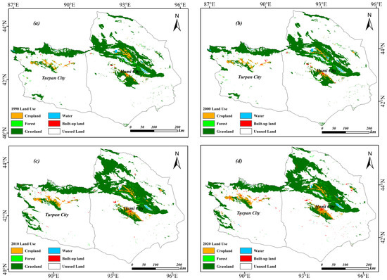 Land use types in different times: (a) 1990, (b) 2000, (c) 2010, and (d) 2020.