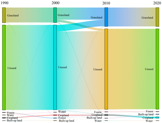 The land use changes spanning 1990 to 2020 are depicted in Figure 2. By 2020, the THB is predominantly characterized by unused land, constituting 78.81% of the total land use area. Grassland is the second largest land use type, comprising 18.81% of the area, while other land use classes have a minor share, accounting for less than 3% of the total. This distribution can be explained by the unique terrain of the THB, where the limited oasis areas result in grasslands and forests primarily distributed along the Bogda Mountains in the eastern segment of the Tianshan Mountains. To visually analyze the land use changes during the study period, a visualization analysis of its transition matrix was conducted (Figure 3). Overall, 89.3% of land use classes remained unchanged. Among them, farmland increased by a total of 1117.57 km2 over the past three decades; forest land shows a consistent decreasing trend, with the largest reduction of 224 km2 observed between 2000 and 2010 and a total decrease of 256.33 km2; grassland exhibits a trend of decreasing and then increasing, notably growing between 2000 and 2010, with a total increase of 7873.40 km2 in the past three decades; water bodies show a fluctuating decreasing trend, with an overall reduction of 67.30 km2; urban areas experience a continuous increase, totaling an increment of 708.05 km2; and unused land exhibits a continuous decrease, with a total reduction of 9375.39 km2. From Figure 4, it can be observed that the increase in grassland primarily originates from previously unused land, and grassland is mainly concentrated around mountain ranges, including the Bogda Mountains in the eastern part of the Tianshan Mountains and the Jueluotage Mountains in the central branch of the Tianshan Mountains. The increase in farmland mainly comes from grassland and unused land, and farmland is predominantly distributed around urban areas.