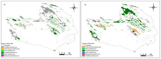 (a) Area decrease and (b) area increase of land use types in THK spanning 1990~2020.