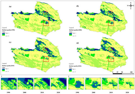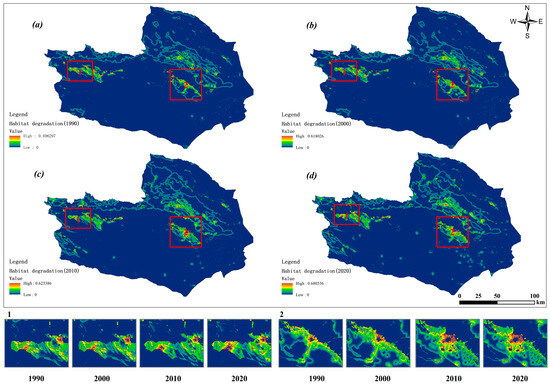Habitat degradation maps in THB at different times: (a) 1990, (b) 2000, (c) 2010 and (d) 2020; Bold 1, 2 represent two sample areas.