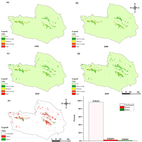 Extent of habitat degradation in THB at different times: (a) 1990, (b) 2000, (c) 2010, and (d) 2020. (e) Changes in habitat degradation during 1990–2020.