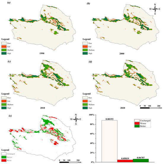The HQ levels spanning 1990~2020 (Figure 8) and their corresponding area changes are presented in Table 4. The area of habitats categorized as poor quality decreased by 3808.2 km2, while the area of moderate-quality habitats increased by 3493.06 km2. Changes in the areas classified as fair and high-quality are relatively minimal. Notably, throughout the period spanning 1990~2020, areas designated as poor-quality habitats consistently account for over 85% of the total area. Areas with unchanged HQ levels cover 88.19% of the total area, while areas with decreased HQ levels account for 5.02%, and those with improved HQ levels constitute 6.79%. Consistent with spatial patterns of land use, areas characterized by poor HQ levels are primarily concentrated within desert regions and urban built-up areas, while areas with high HQ levels are predominantly distributed along mountainous terrains.