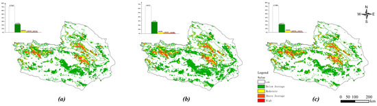 Habitat degradation levels and proportions under three scenarios in 2050: (a) ND, (b) UD, (c) EP.