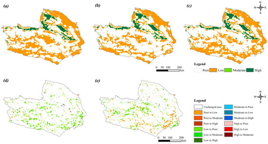 The HQ across different scenarios in 2050 is illustrated in Figure 11. The average HQ under the ND scenario is 0.219, which is 0.201 lower than the UD scenario and 0.223 lower than the EP scenario. The EP scenario exhibits the highest HQ. Across the three scenarios, areas with poor and fair HQ account for over 80% of the total land. The most significant changes occur in areas with lower HQ, whereas areas with moderate or higher HQ remain distributed along the mountain ranges with less noticeable variations. From Figure 11d, HQ levels decrease in the UD scenario compared to the ND scenario, with a shift in most regions from a fair to a poor quality rating. Additionally, Figure 11e shows an improvement in HQ under the EP scenario compared to the NP scenario, with a major transition from poor to fair quality levels.