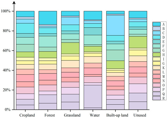 The land use expansion analysis module within the PLUS model employs a strategy to extract and analyze different land use expansions between two periods of change. It then samples from the increased portion and identifies the factors contributing to these expansions using the random forest algorithm. This process enables the determination of the likelihood of the development for different land uses and the quantification of the impact of driving forces on their expansion during this period. Taking the land use data of 2020 as an example, the contributions of 18 driving factors to land expansion during this period are presented in Figure 12. The most significant factor for cultivated land is NDVI, contributing approximately 13.61%, followed by the human activity index with a contribution of about 12.42%. The third influential factor is potential evapotranspiration, contributing around 8.03%. For forests, DEM emerges as the primary driver with a substantial impact of approximately 16.66%, closely followed by potential evapotranspiration with about 13.35%. Rainfall stands out as the dominant factor affecting grassland with a contribution of roughly 13.16%. Both DEM and potential evapotranspiration play a crucial role in the expansion of water bodies, contributing approximately 9.37% and 10.51%, respectively. The human activity index exhibits the highest impact on built-up land, accounting for about 36.79% of its expansion rate while rainfall takes precedence in influencing unused land at around 13.42%. It should be noted that precipitation has a significant impact and contribution of over 5% across all types of land uses. In particular, its impact on unused land and grassland is more pronounced compared to cultivated areas, where its influence is comparatively less. The combined average contribution of precipitation and potential evapotranspiration to all types of land reaches 17%.