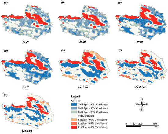 Distribution of hot spots of HQ in the THB at different times: (a) 1990, (b) 2000, (c) 2010, (d) 2020. Distribution of hot spots of HQ for the three scenarios in 2050: (e) ND; (f) UD; (g) EP.