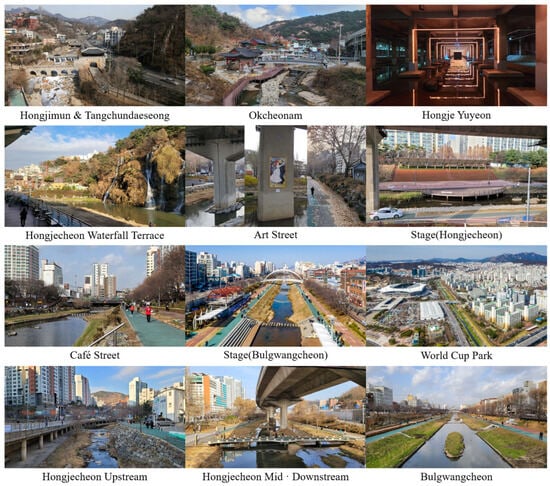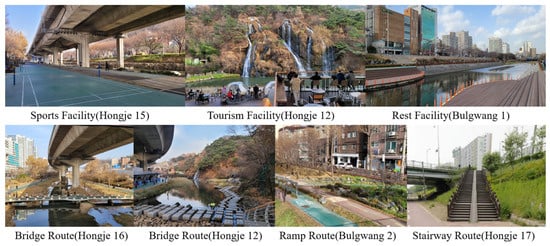 The Bulgwangcheon traverses 2 districts, Eunpyeong-gu and Mapo-gu, to connect downstream to Hongjecheon. Spanning 9.83 km with an average stream width of 43 m, Bulgwangcheon exhibits a consistent landscape comprising reservoirs, floodplains, and embankments from its upstream near Eungam Station to its confluence with Hongjecheon downstream. The main riverfront facilities of Bulgwangcheon are shown in Figure 2. The Bulgwangcheon Café Street is located to the east of Bulgwangcheon and centered on Saejeol Station. In addition to the promenade on the highland site, a deck promenade has been created in the urban space. A riverfront stage near Jeungsan Station is slated for transformation as a waterfront vitality hub by August 2024. In the downstream section, which connects to Hongjecheon, it is adjacent to the World Cup Stadium and World Cup Park on the west side. This section is directly connected to the World Cup Park.