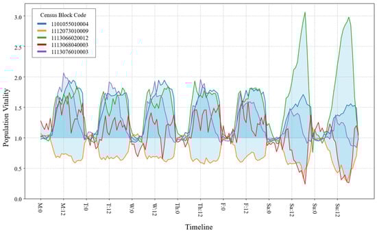 The VI, derived from the PV, indicates the level of activity in an area over a specific period. It is the integral of the previously calculated PV, representing the area under the curve between the PV and the constant function y = 1, that is, the residential population alone throughout the day, as shown in the shaded part of Figure 3, and is measured in [persons/ha/hours]. This value reflects the intensity and duration of an area’s vitality, serving as an effective indicator of activation. We calculated the VIs of weekdays [VI_WD] and weekends [VI_WE] from the integrals of weekday and weekend data, respectively. The timeline was divided into two sections, weekdays and weekends, to examine how visitation patterns vary according to people’s work schedules. Holidays during weekdays were excluded from the analysis because people tend to go on excursions, which results in abnormal trips that are very different from daily visitations.