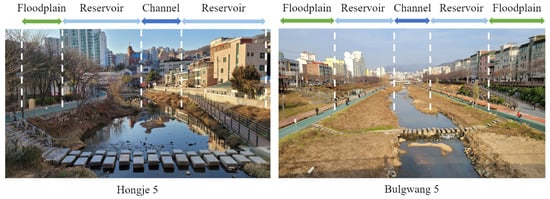 Land use variables include riverside, channel, reservoir, and floodplain widths (WF_width, WT_width, WB_width, WS_width) [] (Figure 4). In land use, the river space is simply labeled as “river, etc.”, but in the field survey, the floodplain, backland, reservoir, and channel vary from segment to segment. Therefore, this study selected the width of the entire river space (WF_width), the channel where water flows normally (WT_width), the reservoir where water often does not flow normally but is considered a natural space and citizens are not free to enter and exit (WB_width), and the floodplain where various riverfront facilities are located and roads such as pedestrian paths are installed (WS_width) as land use variables. There are cases, such as the riverfront segment of HJ 5, where there is no floodplain on one side of the river, which leads directly to the embankment, as well as examples such as BG 5, where the floodplains on both sides are used for various purposes, such as pedestrian paths, bicycle paths, and exercise facilities.