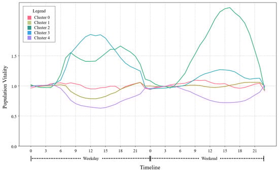 This study reveals the following: first, the K-means clustering analysis of PV patterns categorized the target sites’ riverfronts into five clusters. Cluster 0 (flat cluster) exhibited constant activity, while cluster 1 (afternoon peak cluster) was weakly inactive on weekdays and weakly active on weekends, with a peak observed from 6 pm to 12 pm on both occasions. Clusters 2 (weekend vitalized cluster) and 3 (weekday vitalized cluster) were strongly activated on both weekdays and weekends, with the former exhibiting higher activity on weekends and the latter on weekdays. Cluster 4 (devitalized cluster) exhibited significant inactivity on both weekdays and weekends.