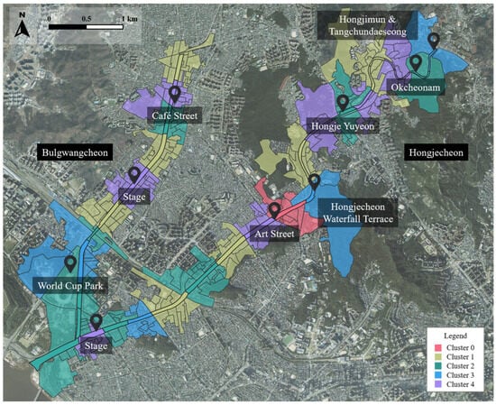 Map of Bulgwangcheon, Hongjecheon, and their riverfront facilities. Shapes represent the census blocks and are color-coded according to the riverfront segments.