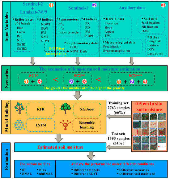 A framework for estimating SM based on multi-source RS data. *** represents the first priority, ** represents the second priority, and * represents the third priority.