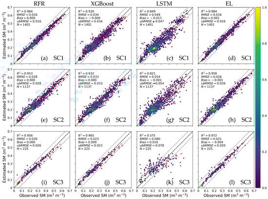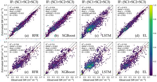 In the training set, under SC1, RFR and EL performed the best, both with an R2 of 0.984 and RMSE and ubRMSE of 0.016 m3/m3. XGBoost had slightly lower accuracy (R2 of 0.930, ubRMSE of 0.034 m3/m3) compared to RFR and EL, while LSTM showed relatively poor performance (R2 of 0.849, ubRMSE of 0.047 m3/m3). Under SC2, EL and RFR demonstrated similar performance. EL achieved an R2 of 0.959 and a ubRMSE of 0.026 m3/m3, while RFR attained an R2 of 0.953 and a ubRMSE of 0.028 m3/m3. LSTM performed the worst, with an R2 of 0.821 and a ubRMSE of 0.054 m3/m3. Under SC3, EL, XGBoost, and RFR demonstrated similar performance, with R2 ≥ 0.956 and ubRMSE ≤ 0.026 m3/m3. LSTM showed a pronounced trend of underestimating high values and overestimating low values under SC3, with an R2 of 0.575 and a ubRMSE of 0.078 m3/m3.