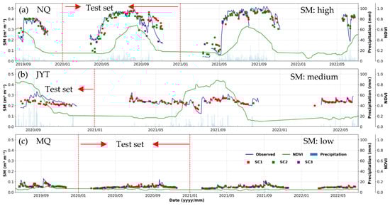 The time series of estimated and observed SM from three scenarios at NQ, JYT, and MQ sites. The blue solid line represents the observed SM at 0–5 cm. The green solid line represents the daily NDVI. The red, green, and purple squares represent the estimated SM for SC1, SC2, and SC3, respectively. The blue bars indicate daily precipitation. The red dashed vertical lines distinguish between the training and test sets.