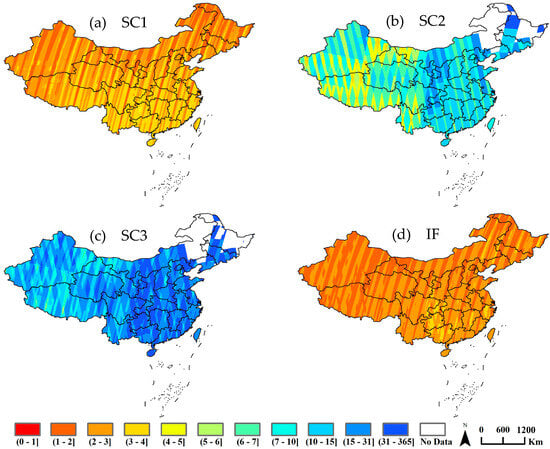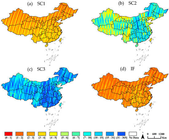 Revisit time between SC1, SC2, SC3, and IF for monitoring SM in China (2021). (a) SC1: Optical RS + auxiliary data only; (b) SC2: SAR + auxiliary data only; (c) SC3: optical RS + SAR + auxiliary data; (d) IF: combined SC3, SC2, and SC1 scenarios.
