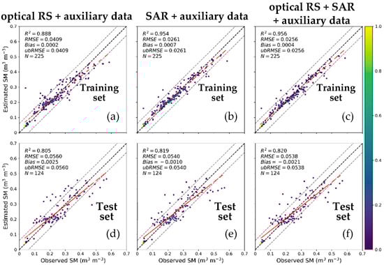 In the training set, the combinations of optical RS + SAR + auxiliary data and SAR + auxiliary data demonstrated similar accuracy. Among them, the accuracy metrics of optical RS + SAR + auxiliary data were slightly better than those of SAR + auxiliary data, with an R2 of 0.956 and an ubRMSE of 0.0256 m3/m3 (Figure 9c). In contrast, optical RS + auxiliary data showed slightly lower accuracy, with an R2 of 0.888 and an ubRMSE of 0.0409 m3/m3. In the test set, the combinations of optical RS + SAR + auxiliary data, SAR + auxiliary data, and optical RS + auxiliary data demonstrated similar accuracy. Among these, optical RS + SAR + auxiliary data achieved the highest accuracy metrics, while optical RS + auxiliary data showed the lowest reliability.