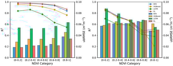 Performance of different models under various NDVI categories in the training set (left) and test set (right). The colored dot lines represent R2, and the bar charts represent ubRMSE.