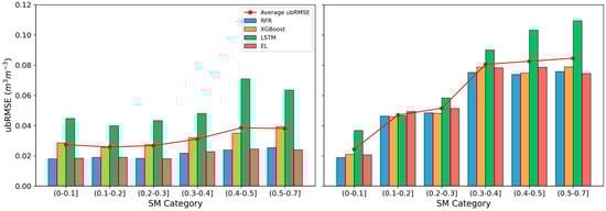 Figure 11 displays the prediction accuracy of four models (RFR, XGBoost, LSTM, EL) under different SM levels, with the left panel representing the training set and the right panel representing the test set. SM is divided into six levels: (0–0.1], (0.1–0.2], (0.2–0.3], (0.3–0.4], (0.4–0.5], and (0.5–0.7]. The bar charts show the ubRMSE for different models, and the red dot line indicates the average ubRMSE of the four models.