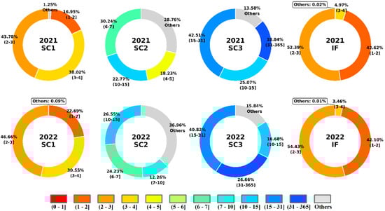 This study analyzed the revisit time of multi-source RS data for monitoring SM at a national scale in China under different scenarios (Figure 12). The results show that SC1 predominantly had a revisit time of (2–3] days in 2021 and 2022, accounting for 43.78% and 46.66% of the total area in China, respectively. The total proportion of areas with a revisit time of (1–4] days was 98.75% in 2021 and 99.90% in 2022, indicating a significant advantage of SC1 in high-frequency monitoring. In 2021, SC2 had the highest proportion of areas with a revisit time in the (6–7] days range, accounting for 30.24% of the total area. However, in 2022, due to the Sentinel-1B sensor malfunction, the proportion of high revisit time monitoring significantly decreased across the monitored area in China. The proportion of areas with a revisit time of (4–5] days shifted from third place in 2021 to the “Other” category in 2022. The proportion of areas with a revisit time of (6–7] days proportion decreased from 30.24% to 24.23%, while the proportion of areas with a revisit time of (10–15] days proportion increased from 22.77% to 26.55%. This change indicates that SC2’s revisit time became more dispersed, with an increase in low revisit time monitoring. For SC3, the primary revisit time across the monitored area in China in 2021 was (15–31] days, accounting for 42.51% of the total area, with areas having a revisit time of (10–15] days and (31–365] days accounting for 18.84% and 25.07%, respectively. In 2022, the proportion of areas with a revisit time of (15–31] days slightly decreased to 40.82%, the proportion of areas with a revisit time of (10–15] days decreased to 16.68%, and the proportion of areas with a revisit time of (31–365] days increased to 26.66%. This shift reflects a move towards lower revisit time monitoring in SC3 during 2022. The IF, which integrates the advantages of SC1, SC2, and SC3, mainly had a revisit time of (2–3] days in 2021 and 2022, accounting for 52.39% and 54.43% of the total monitored area in China, respectively. The total proportion of areas with a revisit time of (1–3] days was 95.01% in 2021 and 96.53% in 2022.