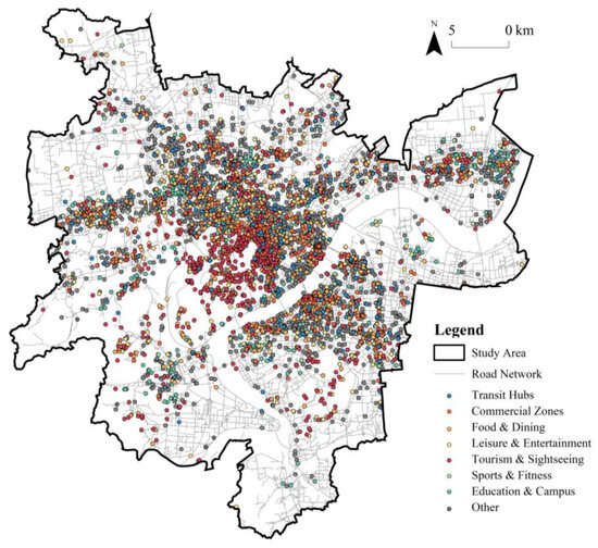 Subsequently, the valid check-in data are matched with the corresponding Baidu Map POIs based on location names and geographic coordinates, assigning functional tags to the check-in points. After filtering incomplete data, 7175 Baidu Map POIs in Hangzhou that interacted with Weibo check-ins are extracted. The data are categorized into eight functional types: tourism and sightseeing (23.0%), food and dining (16.9%), commercial zones (14.1%), leisure and entertainment (7.5%), education and campus (10.1%), sports and fitness (1.3%), transit hubs (2.6%), and others (24.5%). Each check-in point is then converted to the WGS-84 coordinate system and integrated with Hangzhou’s primary, secondary, and tertiary road and infrastructure data obtained from OpenStreetMap in the ArcGIS platform for further analysis (Figure 2).