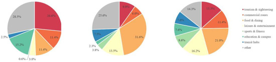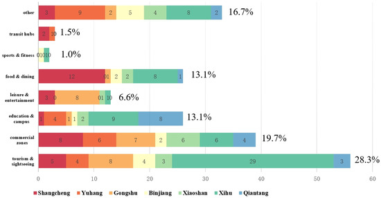 Statistically, 28.5% of all “districts” are recognized as the “other” type—mainly including residence, workplace, and their associated services (Figure 4). “Districts” dominated by tourism and sightseeing rank second, closely behind the first category at 26.6%, and are featured by their smaller coverage and discrete distribution within the previously mentioned middle circle. The result reflects that, despite Hangzhou’s reputation as a tourist city, it has developed mature community-based districts that integrate living, working, and strong mobile internet access. It also highlights the evolution of Hangzhou’s scenic and historical sites, with West Lake and Qiantang River being the most developed, forming large and continuous “districts” with diverse urban functions, in line with the city’s planning scheme. However, areas around Xixi Wetland, Liangzhu Ancient City Ruins, and Xiang Lake have yet to emerge as active “districts” despite significant investment. As mentioned above, food and dining “districts” form a large contiguous zone in the city center and gradually disperse into smaller areas, reflecting a mature catering scene in the old city, anchored by West Lake and Qiantang River. Although centrally distributed, food and dining “districts” account for only 11.4% of the total. However, when considered as secondary and tertiary cognitive functions, these functions rank first, contributing 31.6% and 21.0%, respectively. This underscores how Hangzhou’s catering services are well integrated with other urban functions and widely distributed across the city. Additionally, districts dominated by education and campus, commercial zones, and leisure and entertainment all ranked in the median, while those dominated by transit hubs and sports and fitness are fewer, resonating with trends seen in other large Chinese cities.