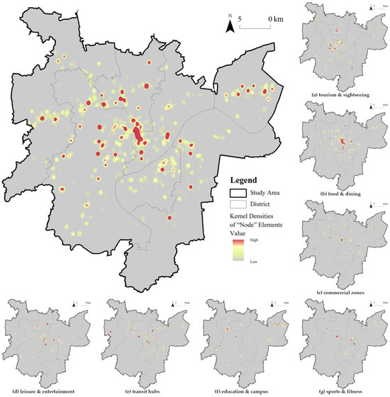 In terms of the temporal effect, transit “nodes” are concentrated around large stations, including Hangzhou’s three railway stations and subway stations (Figure 5e). Most of these “nodes” are in the northeast, with fewer in the less-developed mountainous southwest. Although Hangzhou’s subway network only expanded in recent years, it has already surpassed the bus network in influence, as node distribution shows little connection to bus stops. Another category of recent drivers of Hangzhou’s development, the education and campus “nodes”, are mainly clustered around major university campuses in the city center and western areas, such as Zhejiang University, and in the Xiasha University Town to the east and along the Qiantang River (Figure 5f). They reflect Hangzhou’s urban expansion strategy, where campuses play a key role in forming new urban areas. Finally, sports and fitness “nodes” cluster around the two largest city-level stadiums, district-level sports facilities, and university and corporate sports venues (Figure 5g). The distribution of transit, education, and sports nodes aligns closely with the city’s recent infrastructure booming. Overall, in line with prior research on Hangzhou’s urban transformation and multi-centered development [47,48], Hangzhou’s “nodes” form dense cores in the city center and secondary clusters around sub-centers, effectively reflecting its polycentric spatial planning. Moreover, this paper classifies the “nodes” by functional type, providing a more intuitive representation of the functional specializations of various areas in Hangzhou.