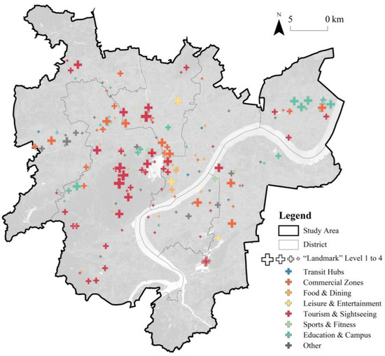 “Landmarks” are point references considered to be external to the observer that are more easily identifiable if there is some prominence of spatial location [1]. In terms of functions, “landmarks” conventionally include important buildings, parks, squares, and tourist attractions. “Landmarks”, in the narrow sense, have distinctive features and often surpass other elements in terms of volume or form. In a broad sense, “landmark” refers to the observer’s mental impression of a place, and the observer can perceive the ambiguous orientation of the place by obtaining information about the place based on existing common sense, media promotion, or navigation platforms.