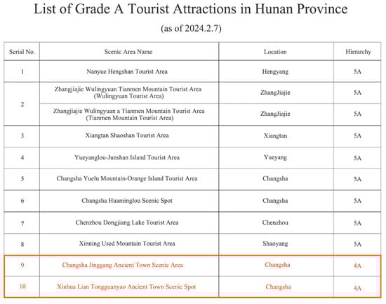 - Both sites share similar characteristics and are rated equally at the national tourism level. The development of both ancient towns aims to foster the integration of culture and tourism, thereby promoting the high-quality growth of the tourism sector [67]. The Tongguan Kiln Ancient Town, following the signing of a cooperation agreement in 2012, completed the Xinhua Lian Tongguan Kiln project in 2018 [68]. This initiative seeks to establish a new tourism landmark that prominently showcases Huxiang culture on a global scale. Similarly, the Jinggang Ancient Town Scenic Area, which opened in 2009, launched its 2.0 development phase in 2022 [69], rejuvenating the town, enhancing the protection of cultural heritage, and positioning it as a premier micro-vacation destination. The Changsha Xinhua Lian Tongguan Kiln Ancient Town Scenic Area and the Changsha Jinggang Ancient Town Scenic Area are both classified as national 4A scenic spots in the “List of A-Class Tourist Attractions in Hunan Province” published by the Hunan Provincial Department of Culture and Tourism [70] (Figure 1).