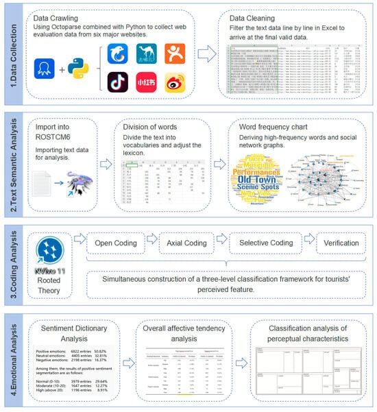 This study integrates the research methods of Murray Parker [64], Weng FF [81], Zhongzhong Zeng [82], and Ziyang Wang [83] regarding public landscape perception and semantic sentiment analysis. This study innovatively applies methods such as text semantic analysis, word frequency analysis, Grounded Theory coding, and sentiment analysis. It introduces novel approaches in classifying tourist perception characteristics and conducting multi-dimensional analysis of these characteristics. The research methodology framework consists of four components. First, network review data related to Tongguan Kiln Ancient Town and Jinggang Ancient Town were collected and cleaned using the Octoparse Cloud Service Cluster, combined with Python, from six selected websites [84,85]. Next, after segmenting the text, word frequency statistics and social semantic networks were generated to capture public evaluations of the two ancient towns. Based on high-frequency words and the semantic network, qualitative analysis was conducted using Nvivo to construct a three-level classification framework for tourist perception characteristics and to code the textual content. Finally, sentiment analysis was performed on both the overall evaluations of the two towns and the individual perception features, exploring the impact of different features on tourists’ landscape perceptions in public spaces [86,87,88]. The specific methods and data processing procedures are as follows (Figure 3):