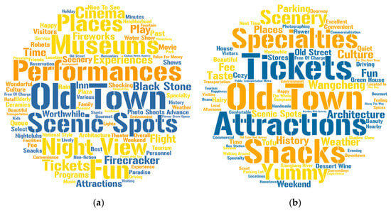 Network text analysis of tourists’ travel records is a vital method for understanding their perception of tourist destination images and serves as a key reference for enhancing the quality of destination tourism services [100]. The frequency of word usage is closely linked to tourists’ experiences; high-frequency words indicate greater attention to the factors they represent, significantly contributing to the formation of a sense of place [101,102]. This study used Rost CM to filter the top 50 high-frequency words from the online reviews of Tongguanyao Ancient Town and Jinggang Ancient Town, excluding terms unrelated to landscape space, colloquial expressions, and numerical symbols (Figure 4). Tourist comments on Tongguanyao Ancient Town primarily focus on “performances, museums, scenic spots, cinemas, fireworks, ironworks, architecture, and culture”. These comments indicate a strong interest in the town’s entertainment options and special performances, highlighting its significant appeal in terms of historical, cultural, and material heritage. In comments about Jinggang Ancient Town, terms like “feeling, characteristics, culture, history, scenery, architecture” indicate a strong interest in the town’s atmosphere, historical and cultural heritage, and landscape. Meanwhile, words such as “snacks” and “flavour” reflect tourists’ appreciation for the local cuisine.