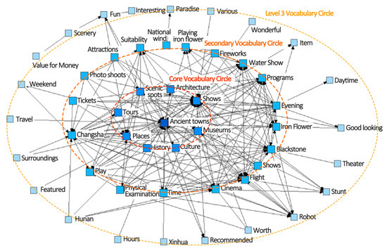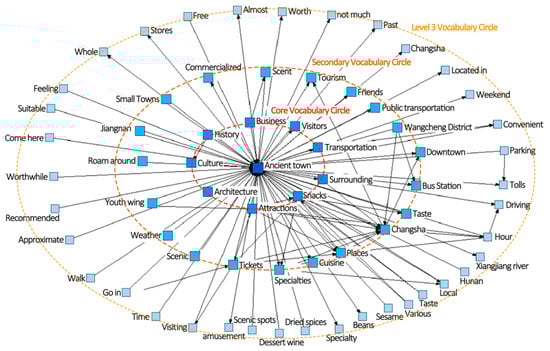 Semantic networks represent the application of complex network technologies in natural language processing [103], overcoming the limitations of traditional NLP tools and statistical methods [104]. Additionally, geospatial semantic networks are increasingly being adopted by various digital cultural heritage repositories [105]. The study screened and analyzed high-frequency words from the evaluations of the two ancient towns, constructing a co-occurrence matrix network diagram (Figure 5 and Figure 6). This diagram visually represents the co-occurrence frequency of the words and categorizes them into three tiers based on their relationships, revealing the underlying social dynamics and semantic network characteristics in the tourists’ comments. In the social and semantic network diagram of Tongguan Kiln Ancient Town, the core high-frequency word node group includes “scenic spot, architecture, tourism, performance, place, history, culture, museum”. Related words like “national style, fireworks, ironworks, cinema, photography” form a secondary vocabulary circle. The strength of the associations among these nodes and the resulting network structure reveal the dual appeal of Tongguan Kiln Ancient Town in entertainment experiences and historical culture. In the network map of Jinggang Ancient Town, the words “business, tourists, traffic, surroundings, snacks, attractions, architecture, history, culture” occupy the core frequency circle, while “weather, scenery, local, food, public transport” are closely linked. The co-occurrence patterns of these words highlight Jinggang Ancient Town’s unique appeal in cultural heritage, natural beauty, and architectural character, reflecting tourists’ strong appreciation and evaluation of the local cuisine and commercial atmosphere.