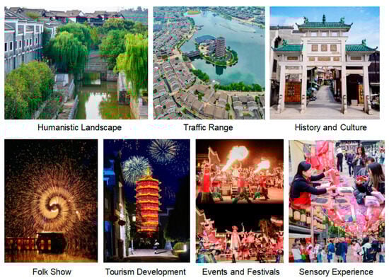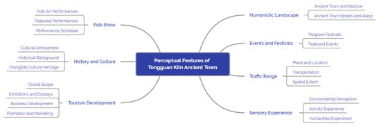 - The two ancient towns share five similar features in their core perceptual features: humanistic landscape, transportation, tourism development, history and culture, and sensory experience (Figure 9 and Figure 10). They also have two closely related features: folklore performance and folk art. The “Folk Show” in Tongguan Kiln Ancient Town showcases traditional culture and intangible heritage through performances, enhancing the entertainment and interactivity of tourism. In contrast, the vibrant “Folk Art” of Jinggang Ancient Town, including shadow puppetry and cloth art, reflects contemporary cultural characteristics through exhibitions, offering tourists enjoyable learning and hands-on experiences.