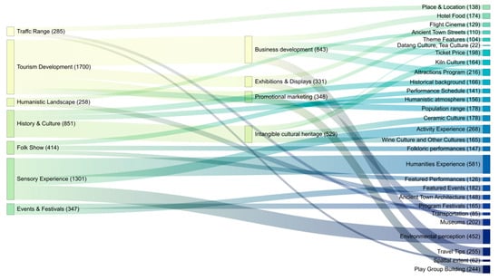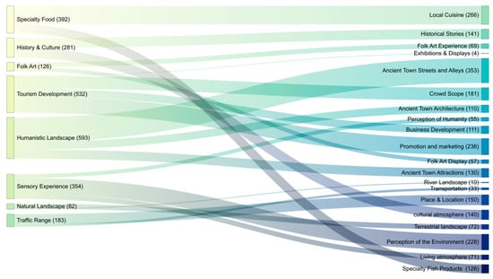 Based on the logical analysis of the review texts and Nvivo coding, a three-level classification of perceptual features was established for the two ancient towns, with the first level representing the core perceptual features. Perceptual features is the sum of all sensations and perceptions in the text of the tourists’ review of the experience of the tourist attractions in the ancient town, and it is a generalized expression [106]. Tongguan Kiln Ancient Town includes seven perceptual features: humanistic landscape, transportation, history and culture, folk performances, tourism development, activities and festivals, and sensory experience. Jinggang Ancient Town includes eight perceptual features: natural landscape, humanistic landscape, transportation, history and culture, folk art, tourism development, specialty cuisine, and sensory experience (Figure 7 and Figure 8). Among them, sensory experience is a feature extracted from the text of online reviews about tourists’ spatial experience and feelings about the overall landscape of the scenic area after their visit.