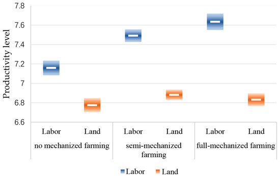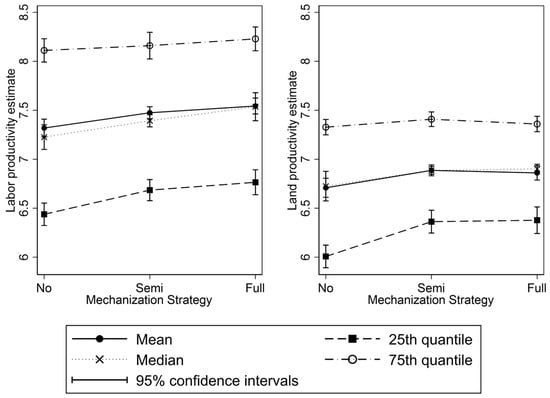 To capture the labor and land productivity, we calculated the per effective agricultural labor and per mu crop income for each household and used their logarithmically transformed values in the analysis. Agricultural mechanization was assumed to help foster labor and land productivity and, therefore, the productivity in monetary units. Figure 1 demonstrates the means and 95% confidence intervals of labor and land productivity by the mechanization strategies. With an upgrade in mechanization strategy, labor productivity increases consistently, while land productivity exhibits a difference between no-mechanized farming and mechanized farming with no notable incremental increase.