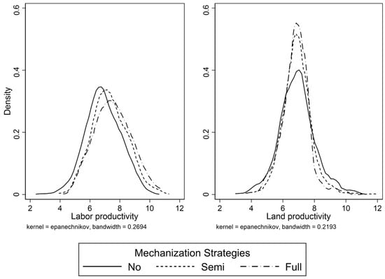Kernel density plots of labor and land productivity for different mechanization strategies.